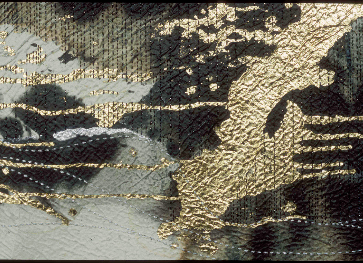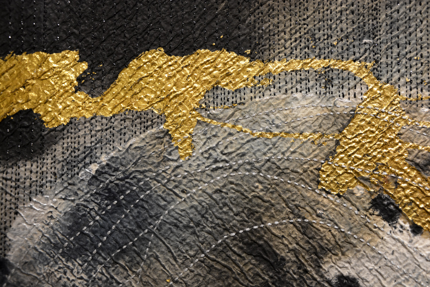 | Medium | 18 karart gold leaf, indigo pigment, iridescent acrylic medium, metallic silver and metallic black thread, Mixed media sashiko: abaca washi, sumi ink, with black |