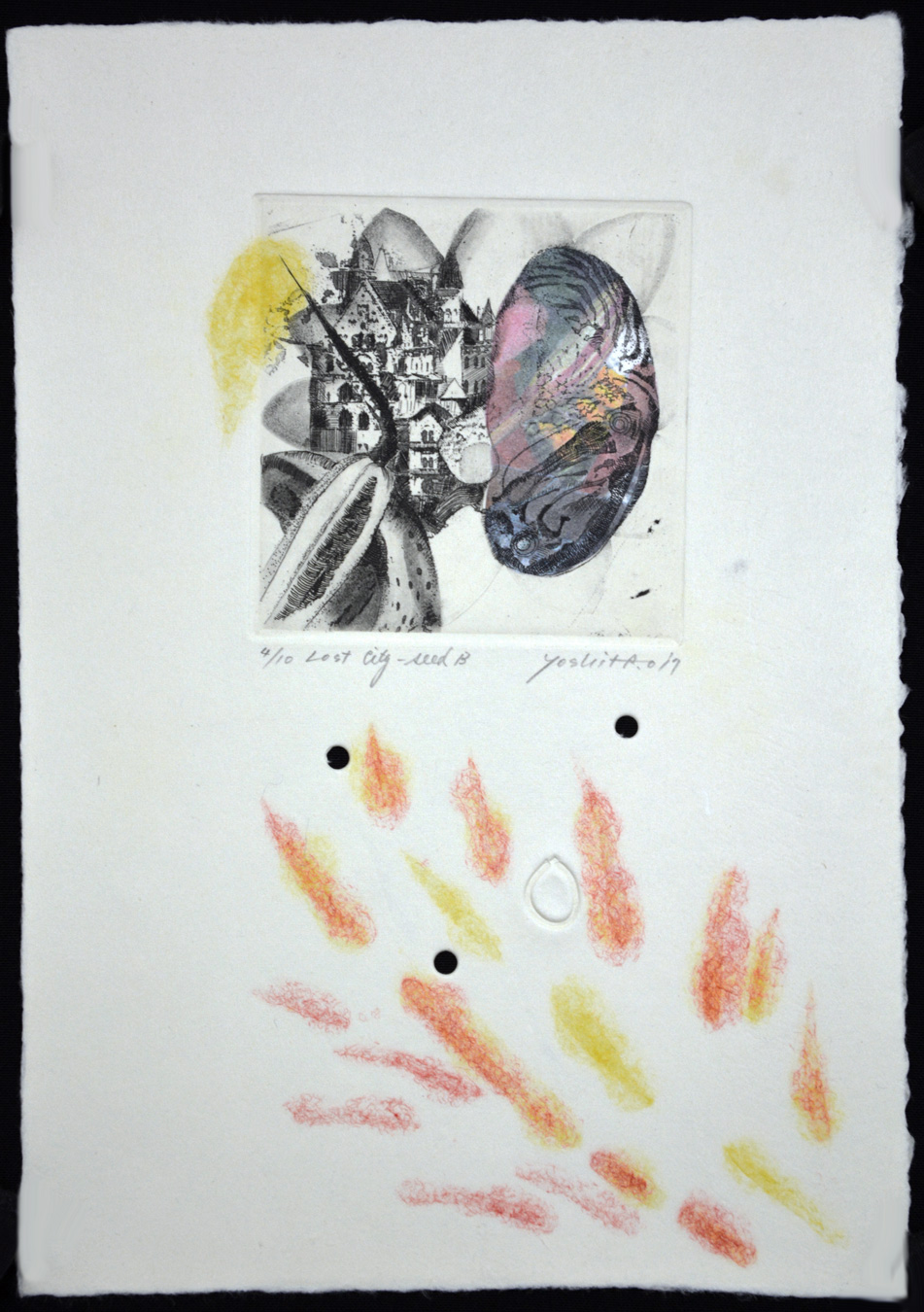 The artist makes his own Japanese paper. Each edition has a unique watermark, and some prints have holes in the paper included in the design