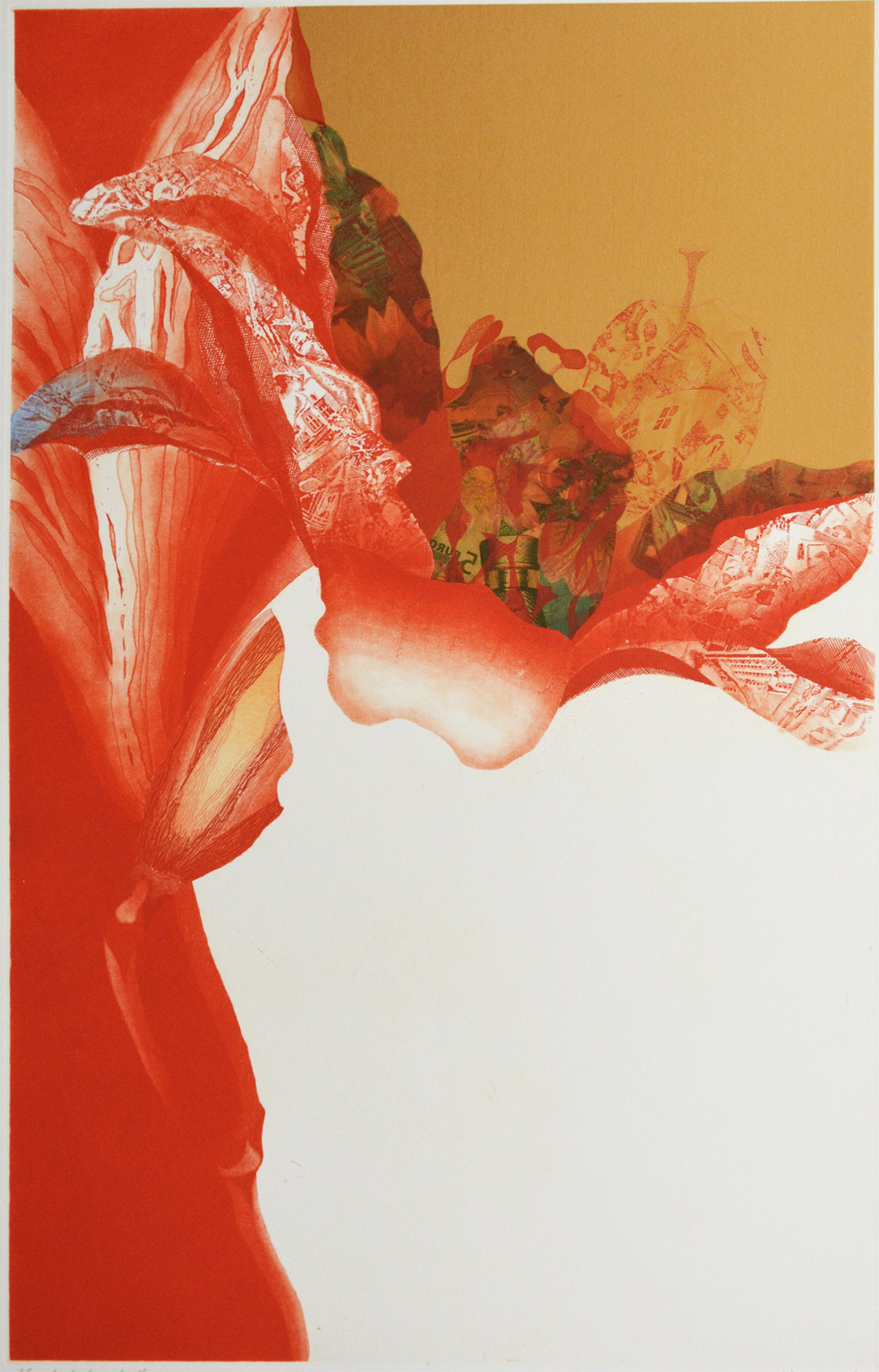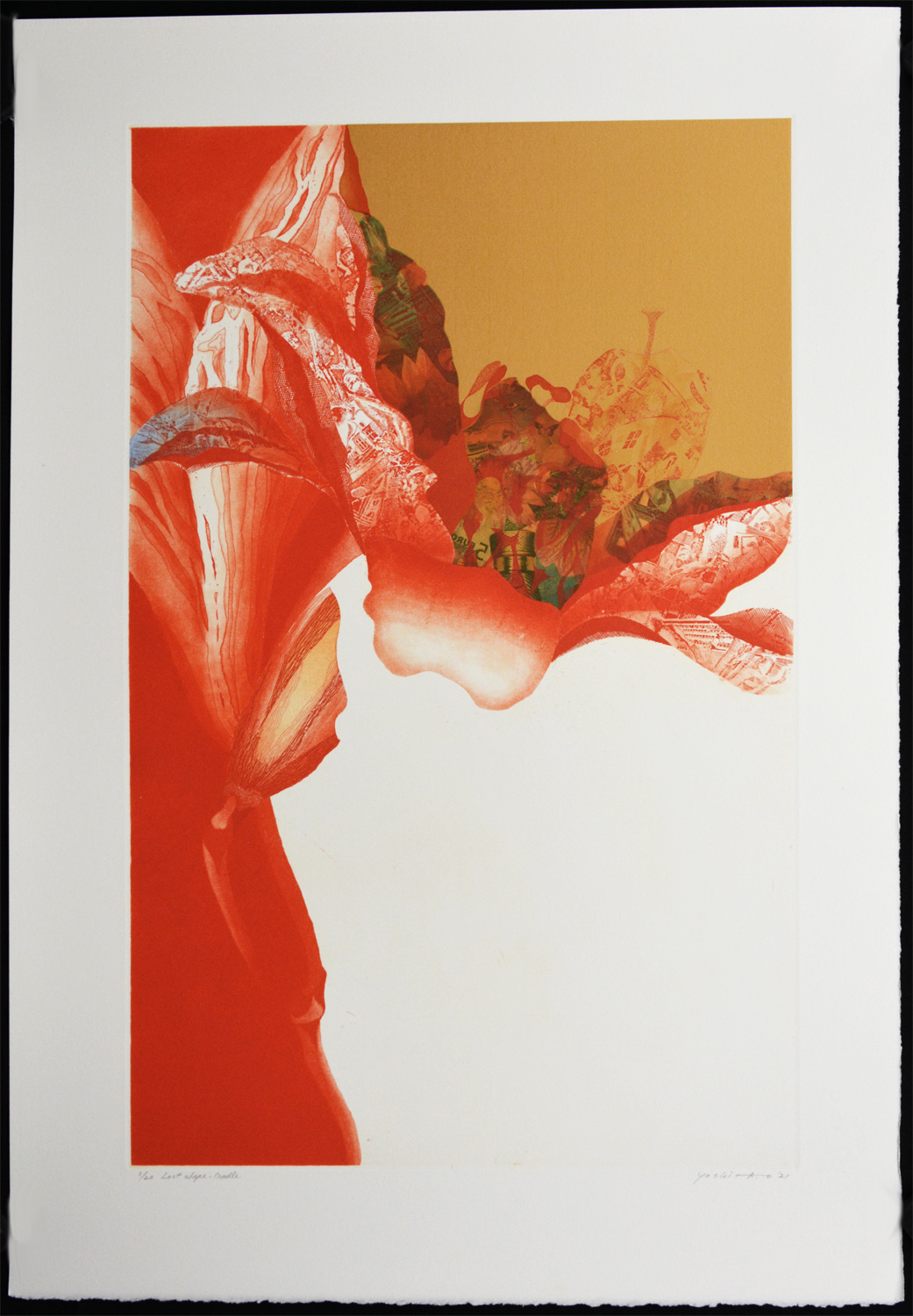 Mr. Arichi uses techniques such as etching and aquatint when making color copperplate prints. His use of collage of gold and silver sheets, creates a metallic texture as well as decorative flavor. He is able to create a feeling of transparency, brightness, and tranquility of color. This combination of color and surface texture create some optical effects impossible with printing ink in a factory.