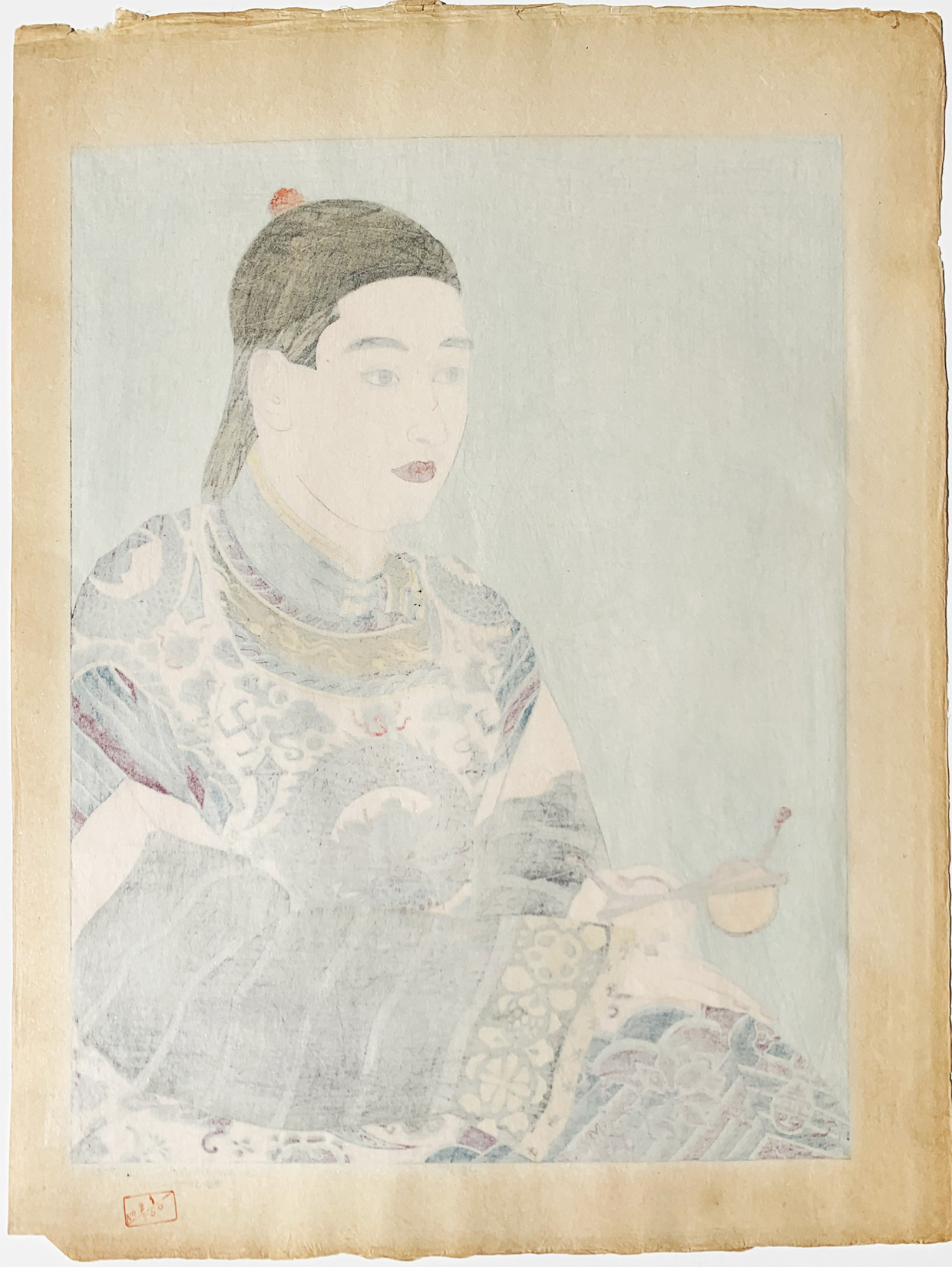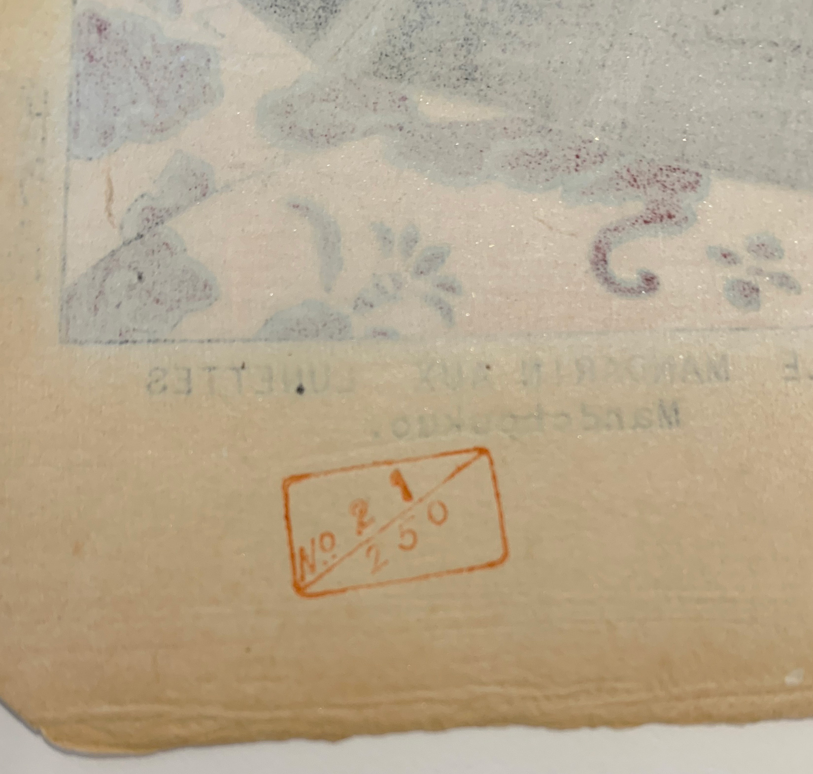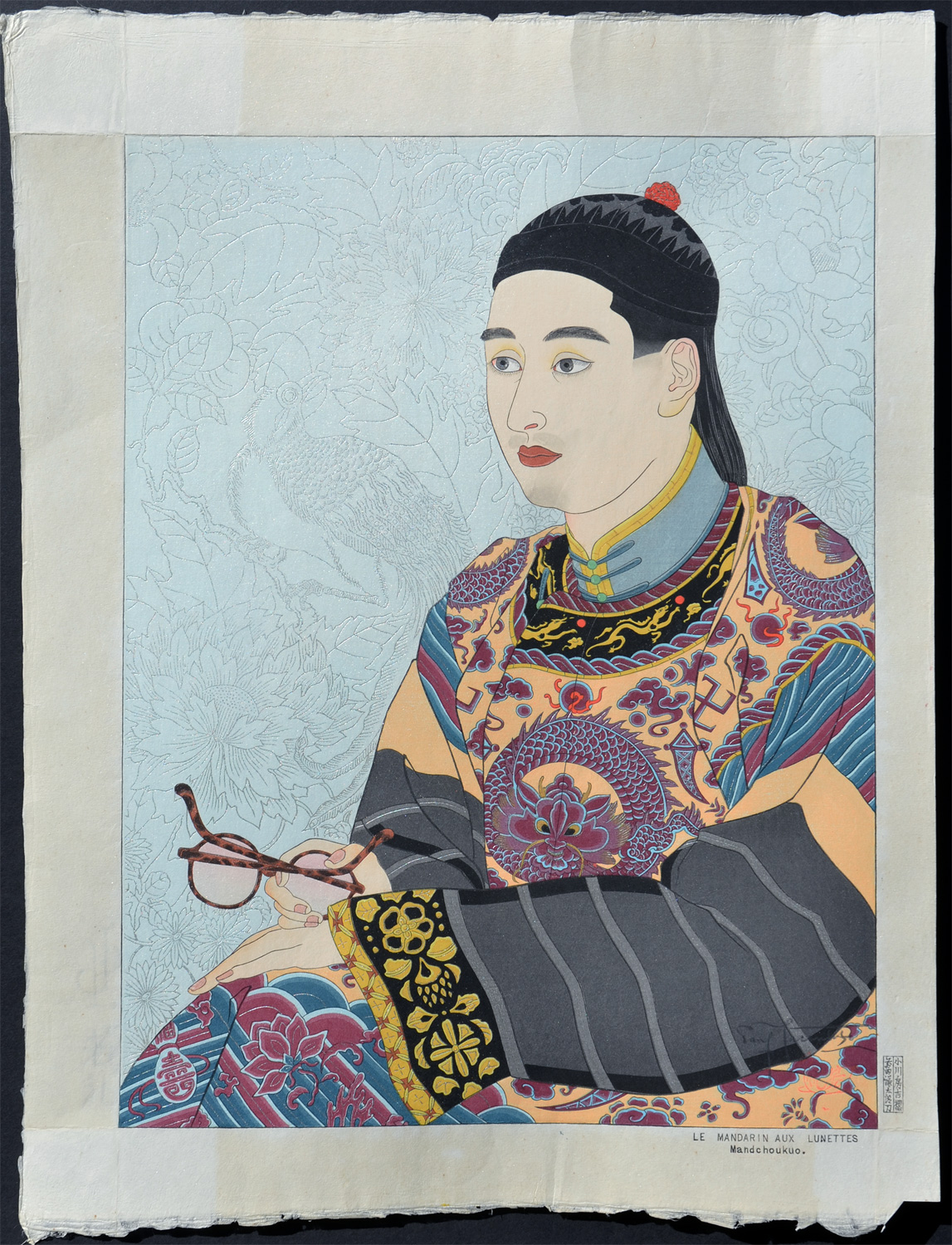 Miles Catalog No. 106. A very complex image which proved too costly to produce in the 1930s when initially designed. Silver, gold, bronze and mica with pink pearl powder on lenses. Delicate filigree in silver for the background design of flowers and birds.