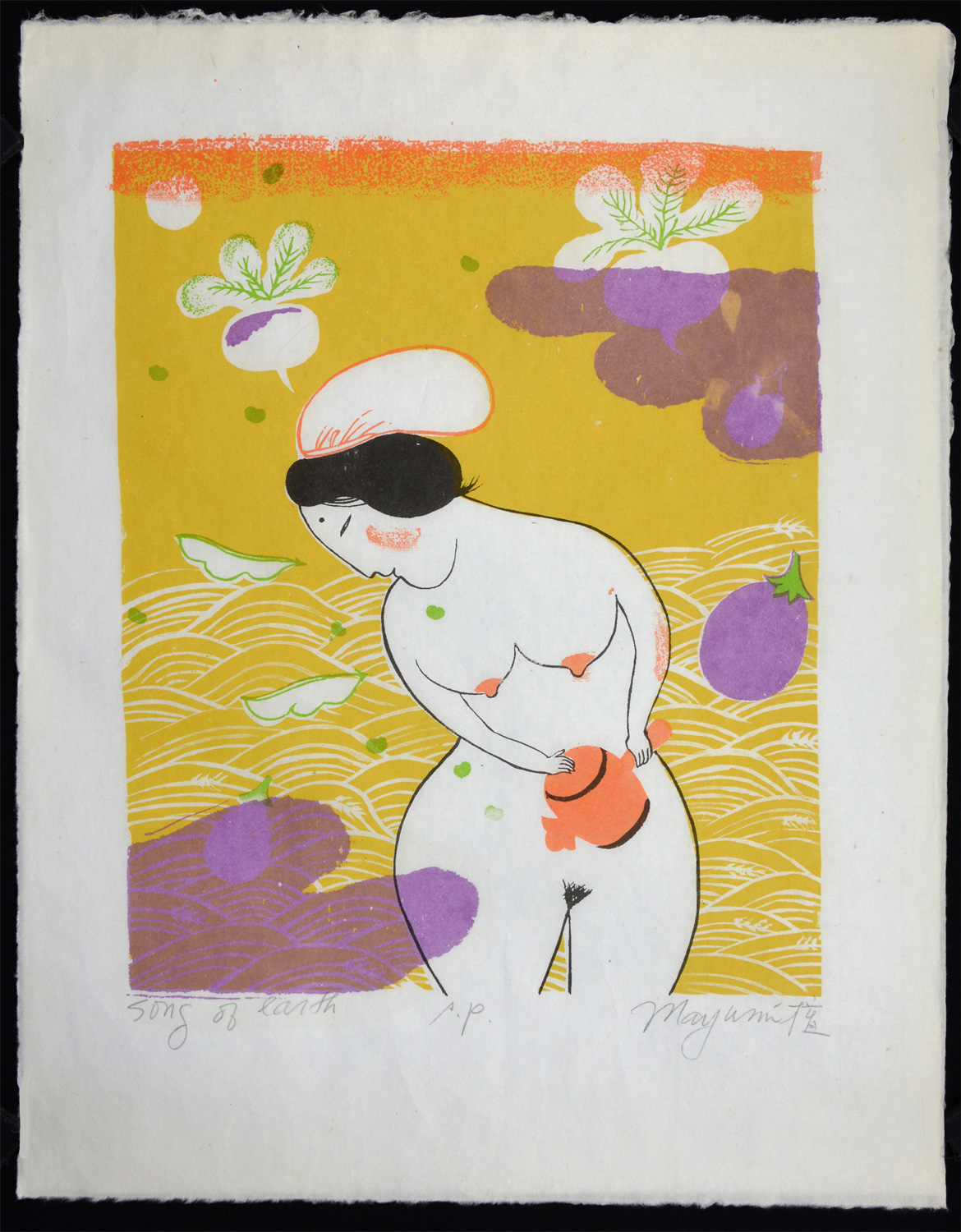This is the first time Mayumi depicted Daikoku the God of Fortune from the earth. Traditionally Daikoku is shown wearing this type of headdres and wielding a magic mallet.