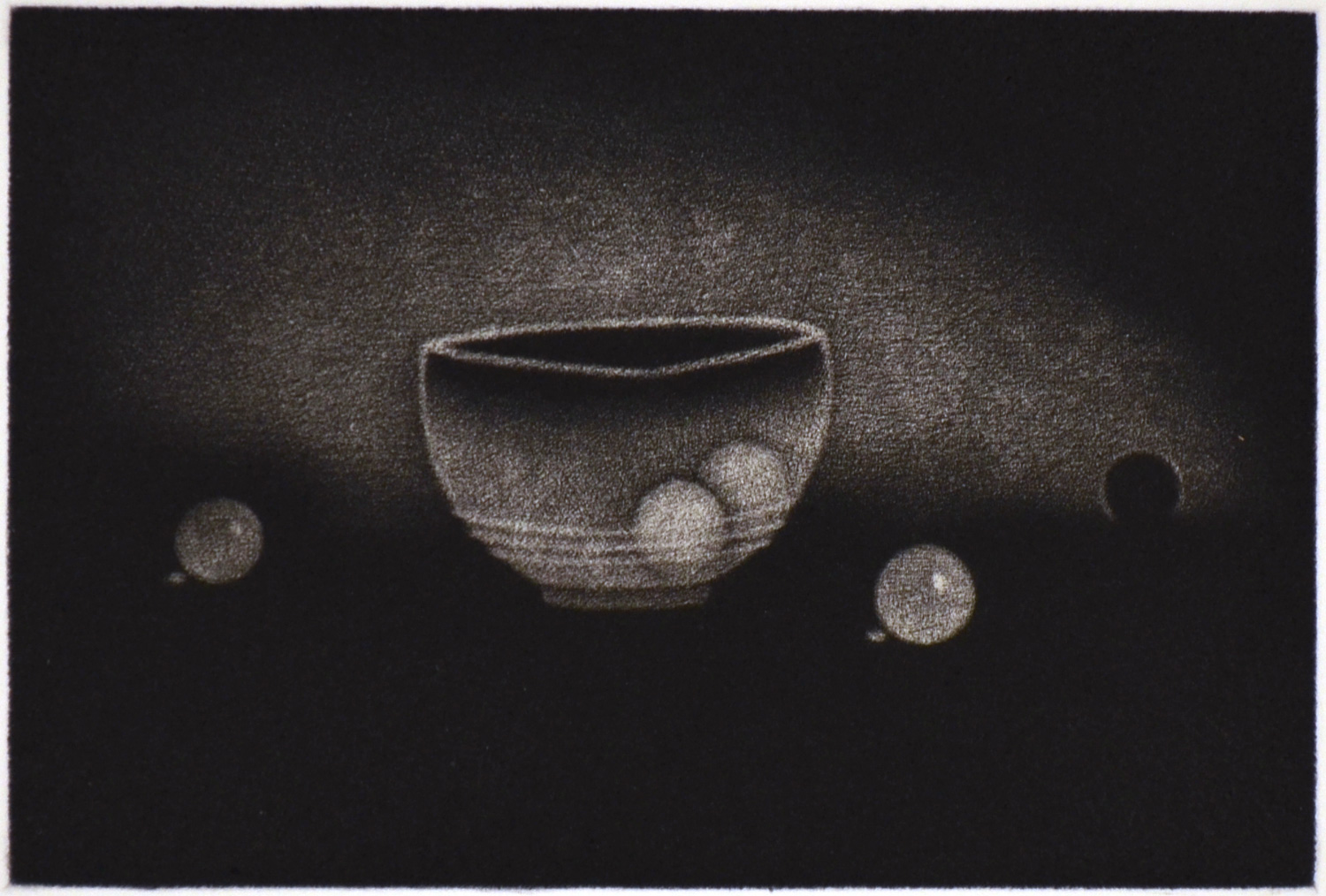 What might be those fruits? The design draws in the viewer to study the composition closely. Note the subtle array of blacks in this stunning mezzotint.