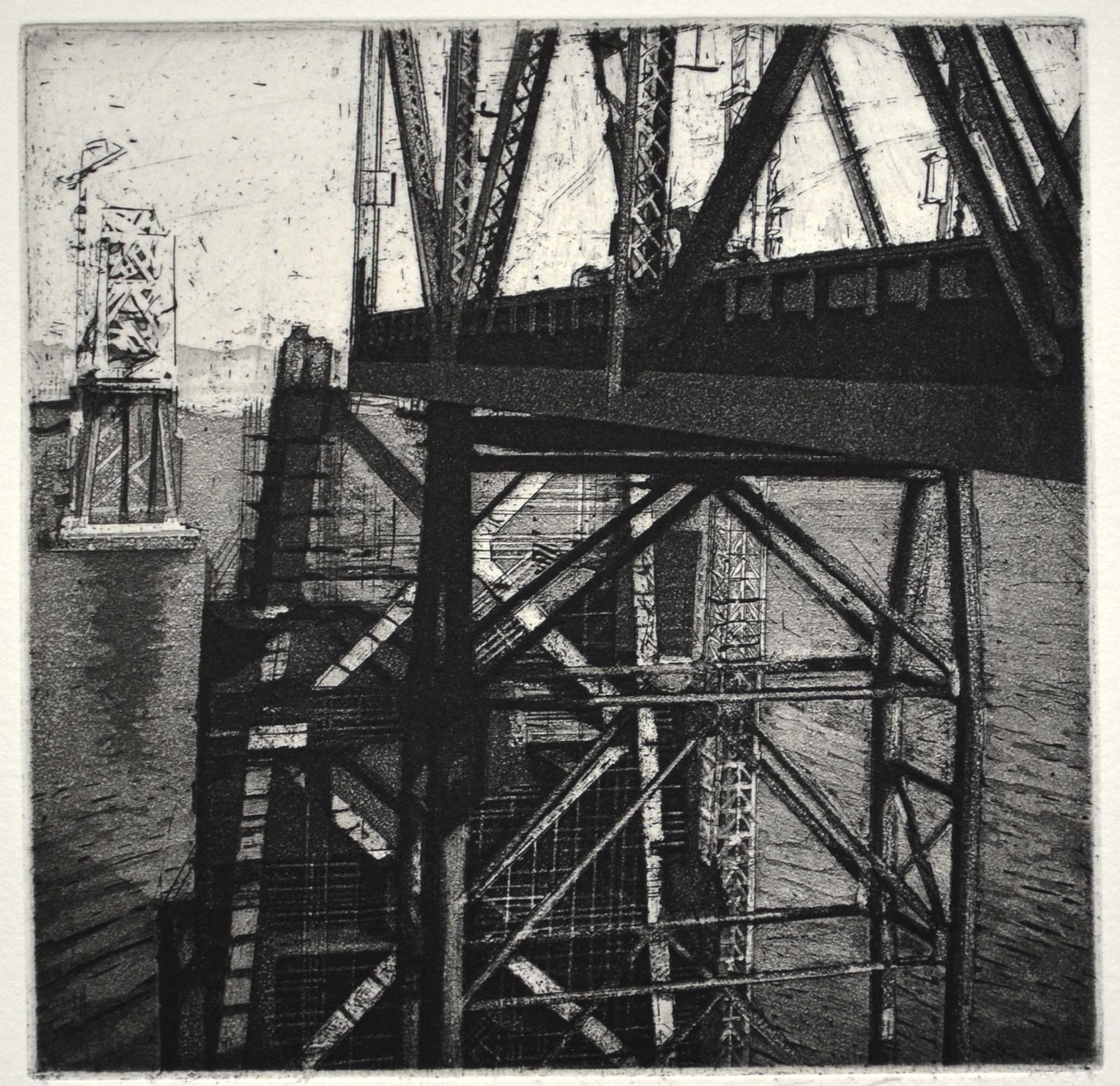 This is one in a series of sixteen depicting the removal of the old span of the San Francisco Bay Bridge.
