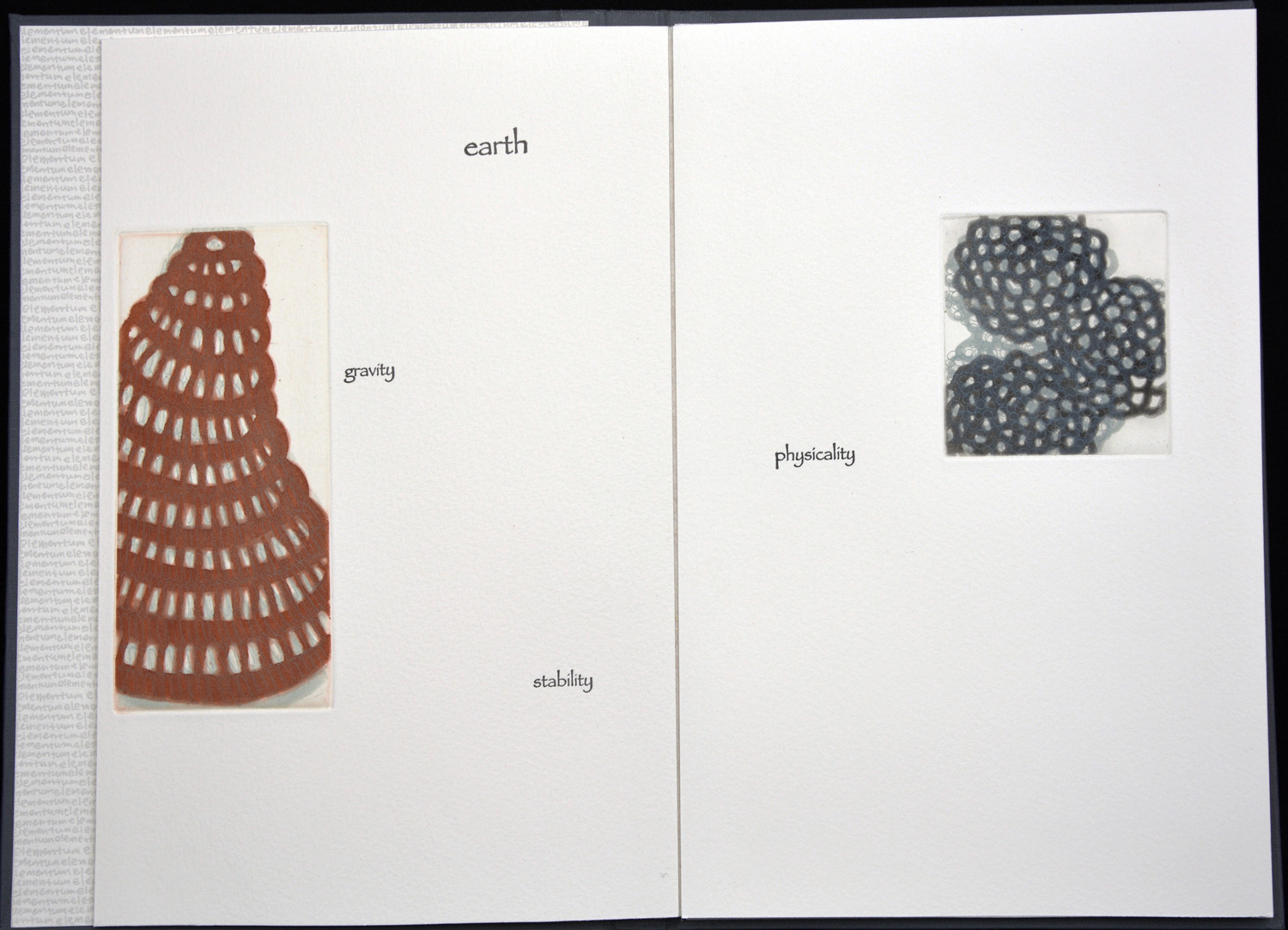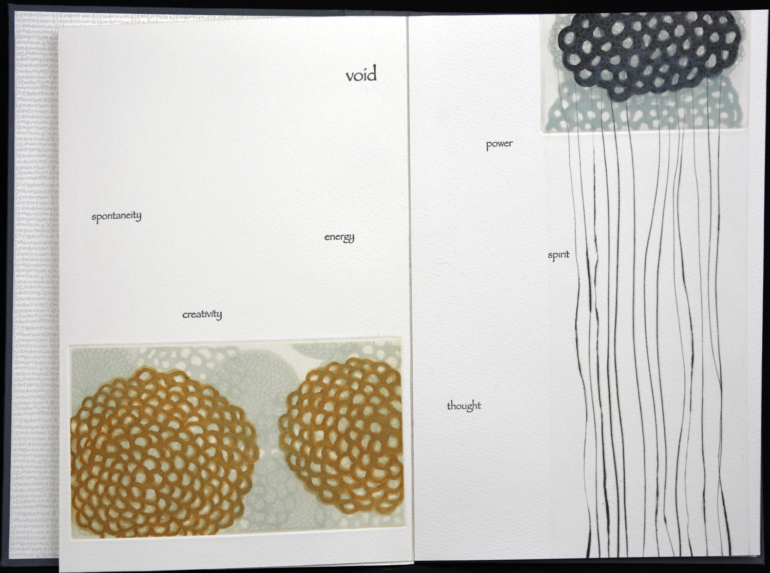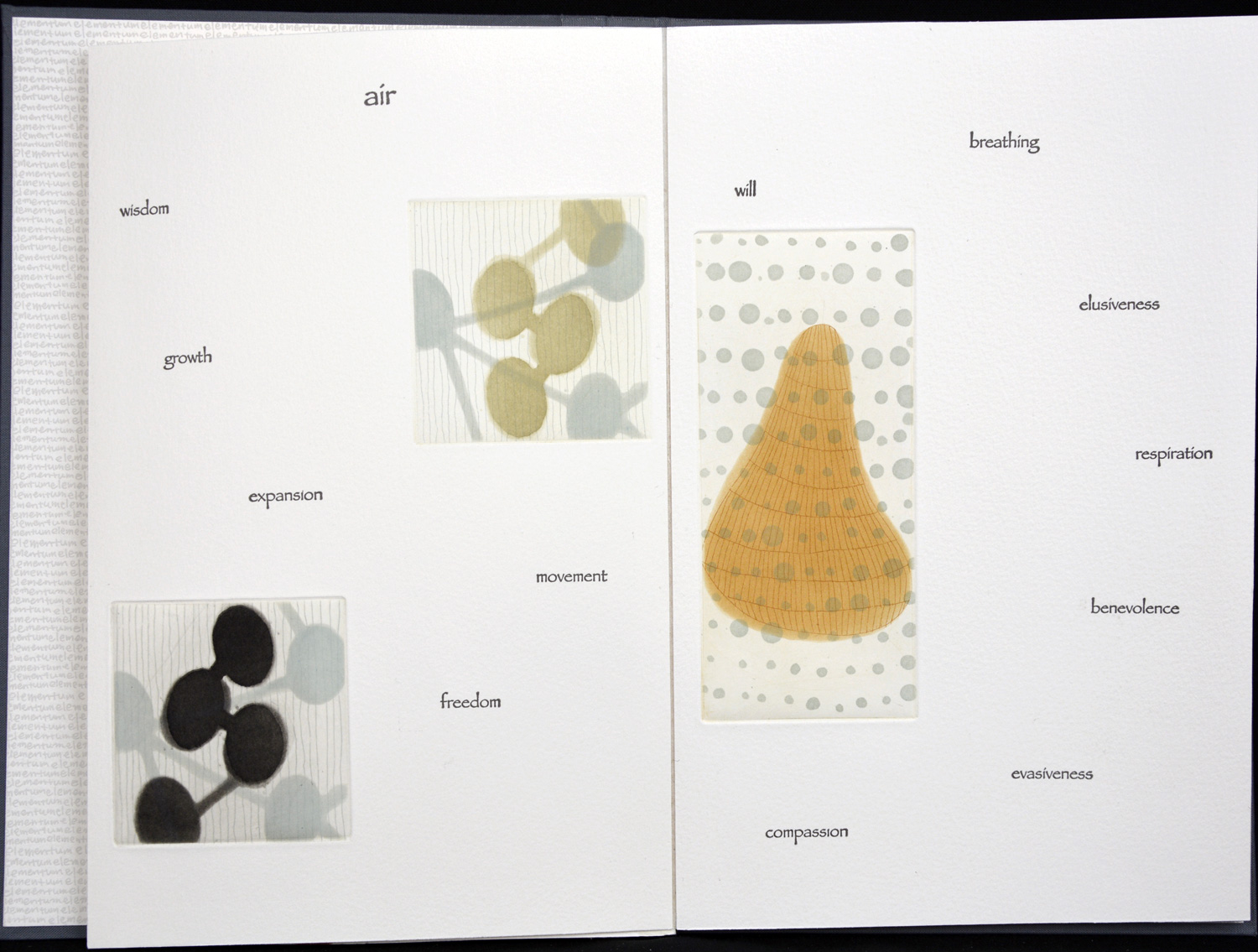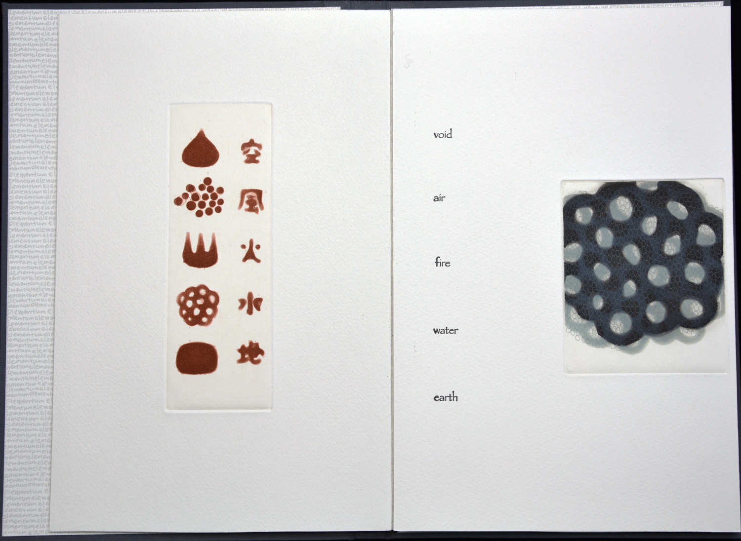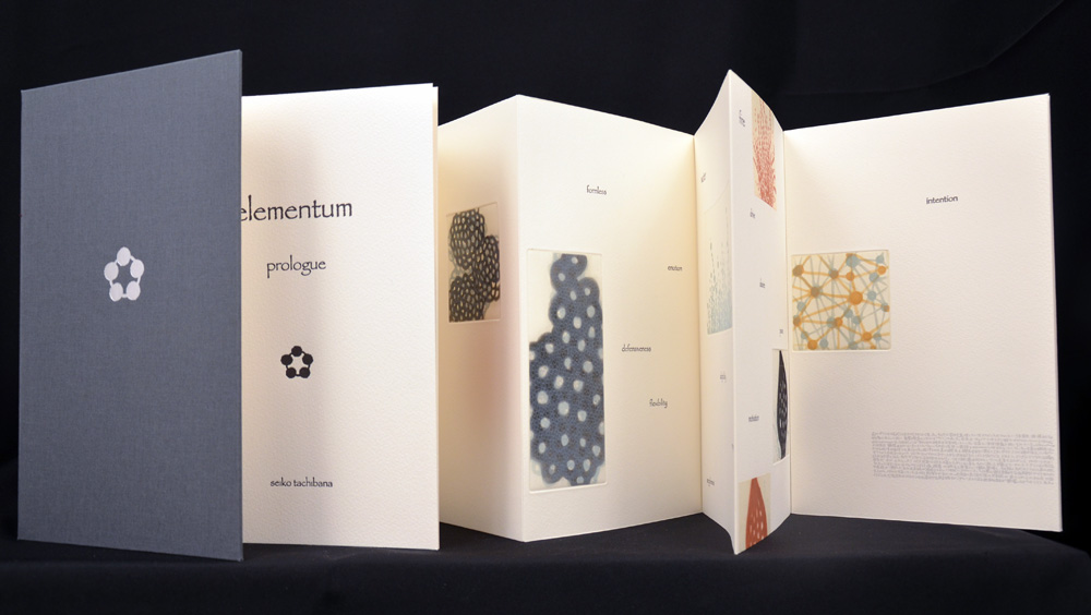 This book explores the five basic elements in Asian tradition–earth, air, fire, water, metal (or void). Seiko incorporates many small images with human characteristics associated with each element. A small book to savor slowly as you turn the pages. Printed, designed, and hand bound by the artist.