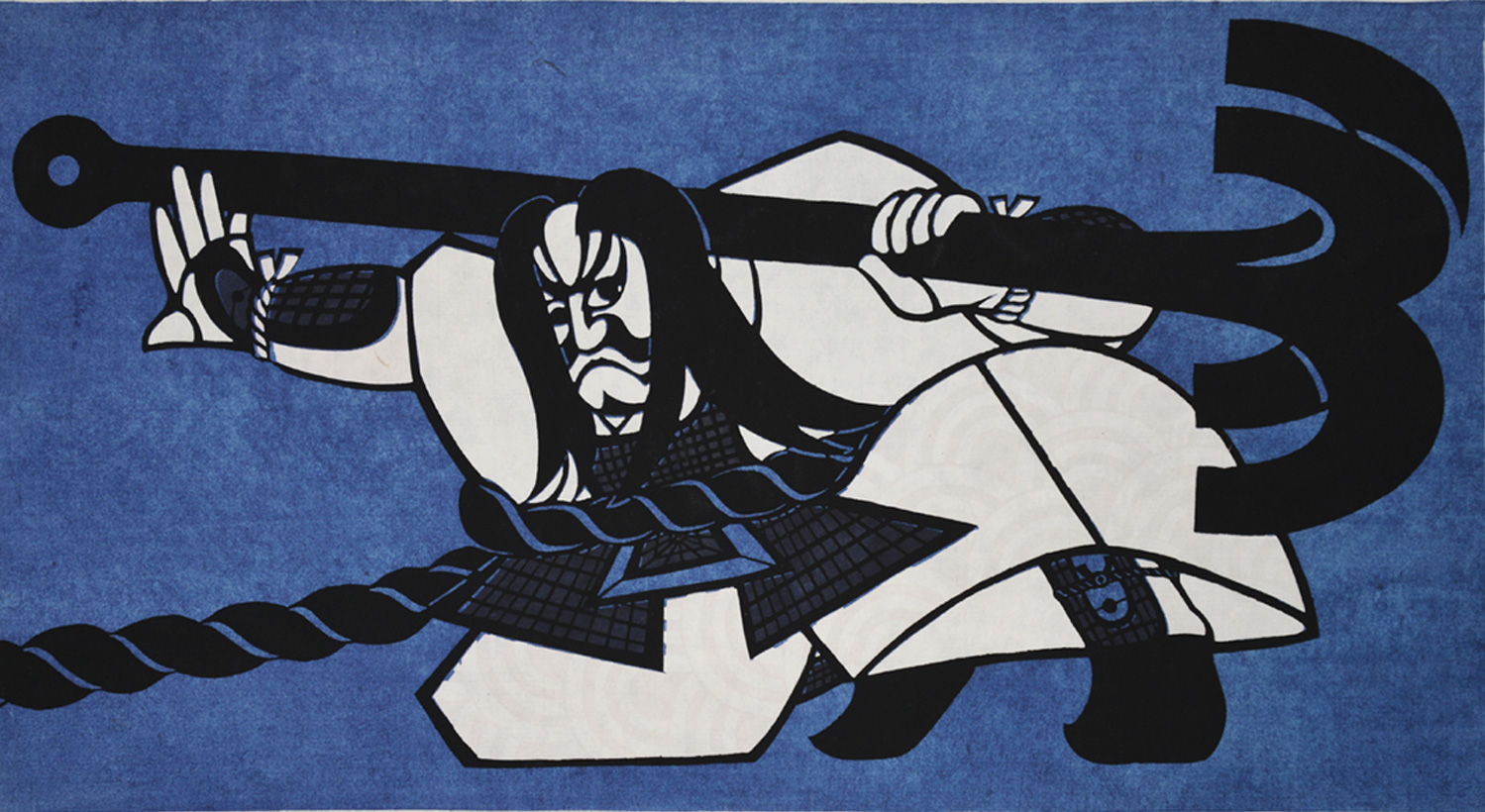 A famous Kabuki scene of a ship’s captain threatening heroic suicide weighed down by an anchor. Note the subtle pink design in his costume