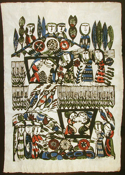 Two papers were joined to make this extra large print with a very complex design. It depicts Ruth harvesting in the barley fields in order to support herself and her mother-in-law, Naomi. A wonderful story of devotion.
