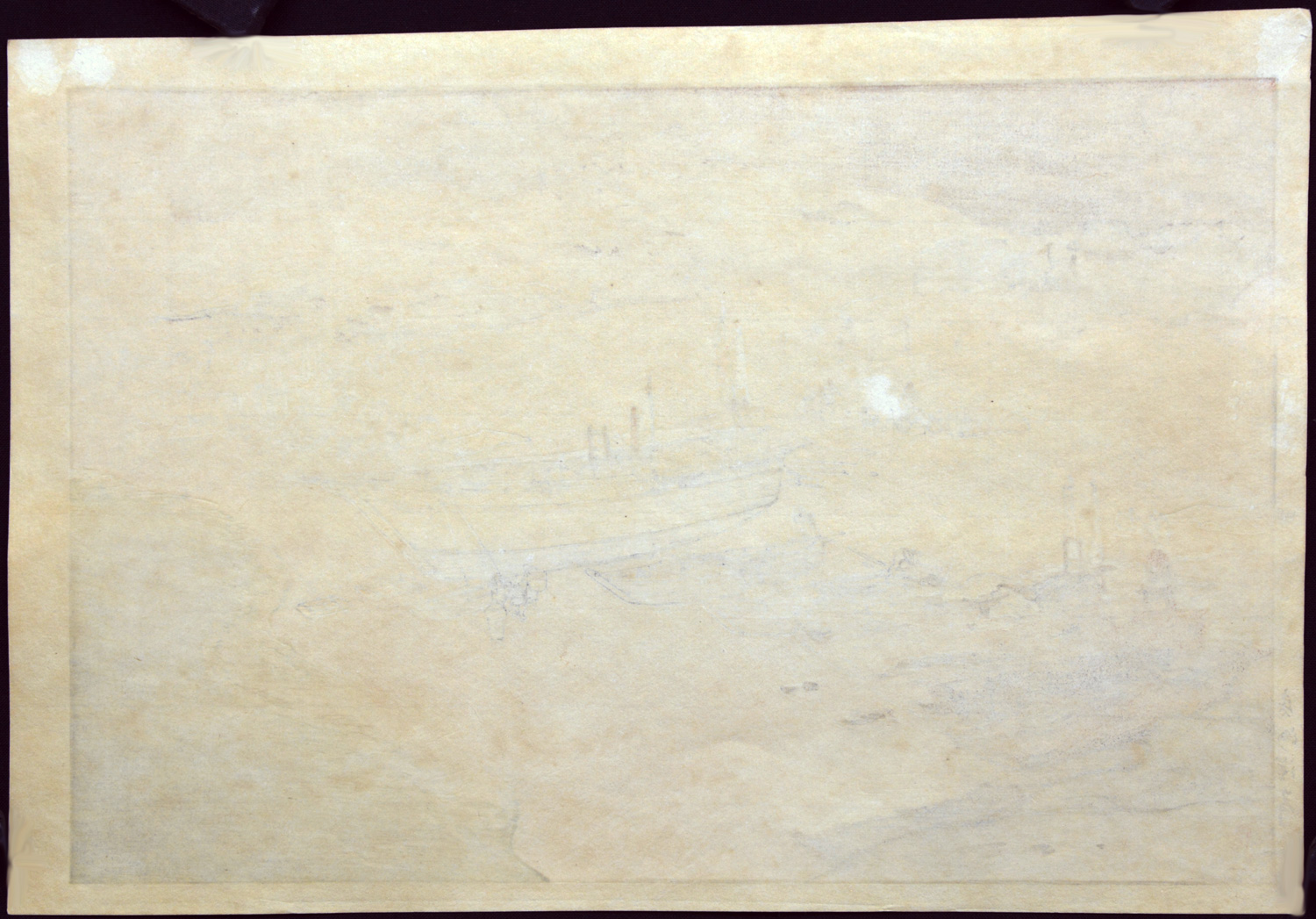 A quiet scene of a fishing village with boats and people hard at work. Note the subtly embossed smoke rising from the fire center left, and the embossed surf. A nice companion in both theme and coloration to A Spring Day.