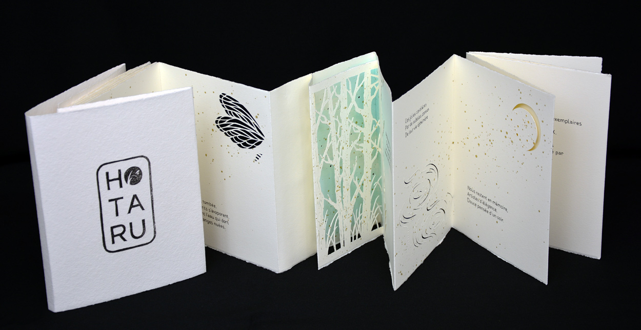 This wonderful handmade accordion-fold book showcases six delicate cutouts with watercolor painting, and four poems.