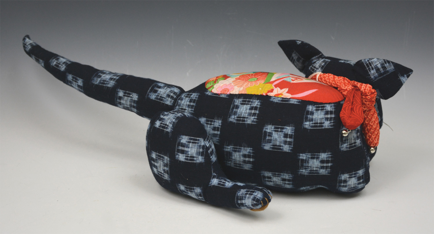 Handmade in Japan. Indigo dyed and blue kasuri cotton from vintage kimono, girl’s silk kimono for applique, obi sash for collar, brown Kauri for paws, paper yarn whiskers and wire in tail