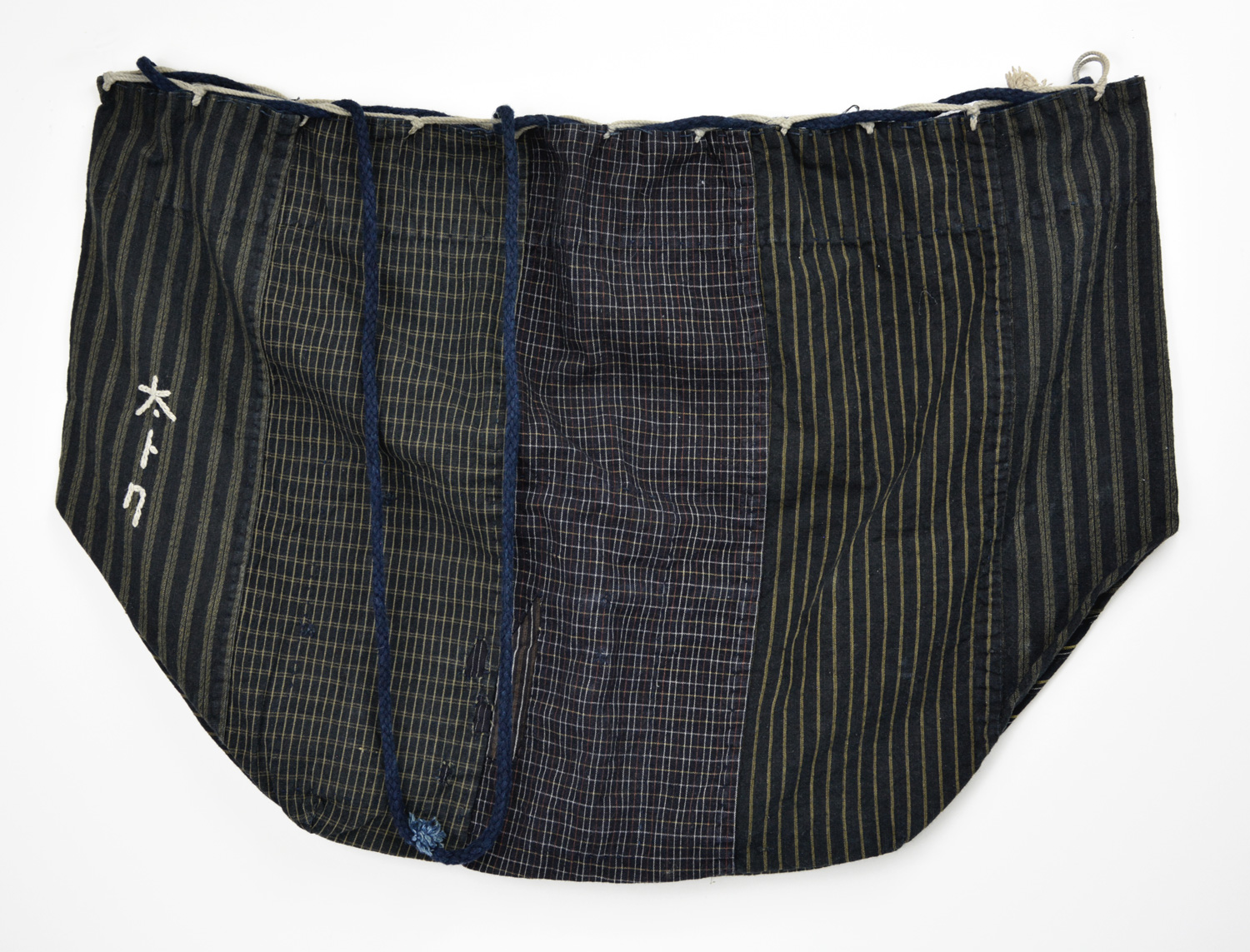 The bag has a cord and is a patchwork of indigo fabrics. The owner’s name is hand-stitched Japanese kanji.