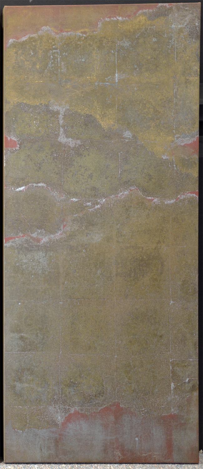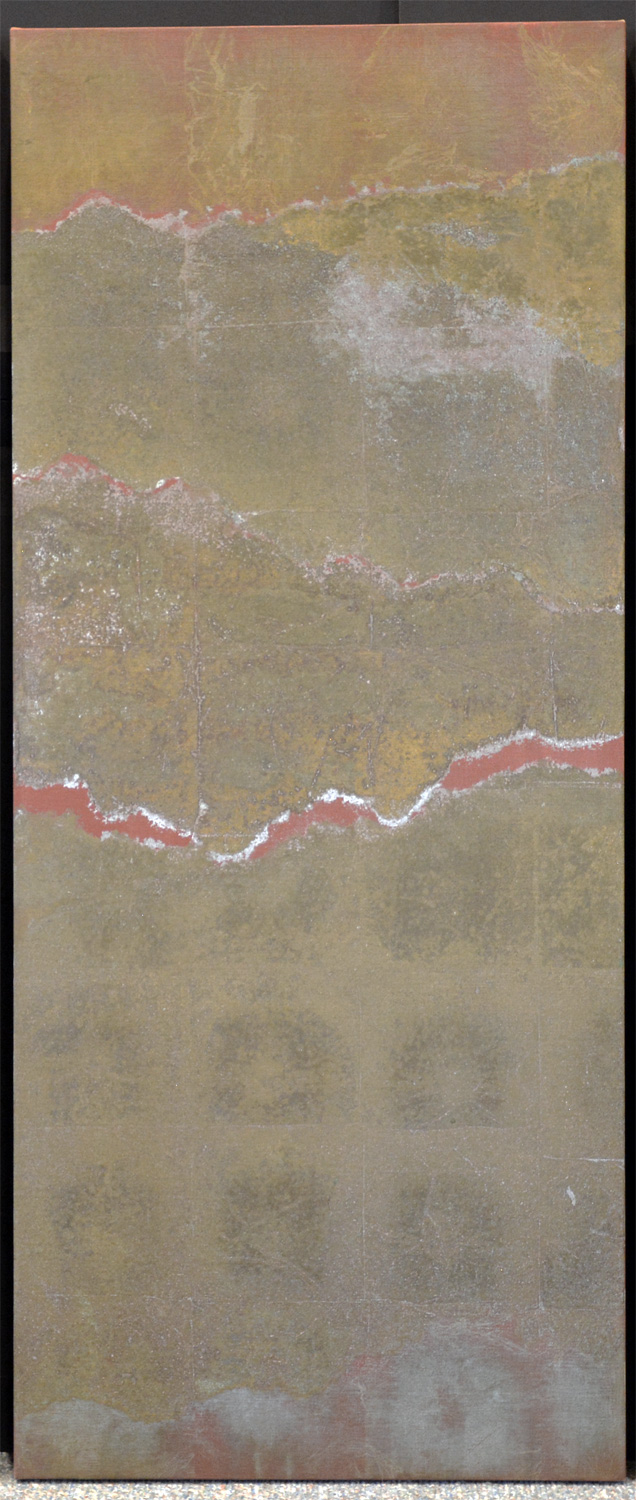A subtle design by the famous Sonoma County artist. Ron often used a subtractive method in his paintings. Here he offered an abstracted landscape, which is interpreted differently by every viewer. This was completed shortly before his death, and may be the last one he ever made.