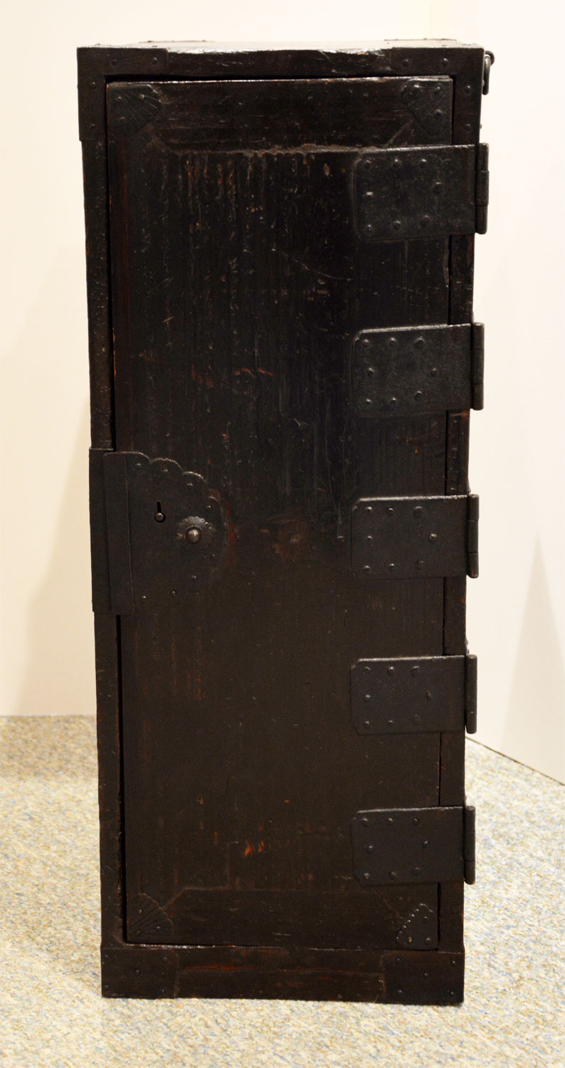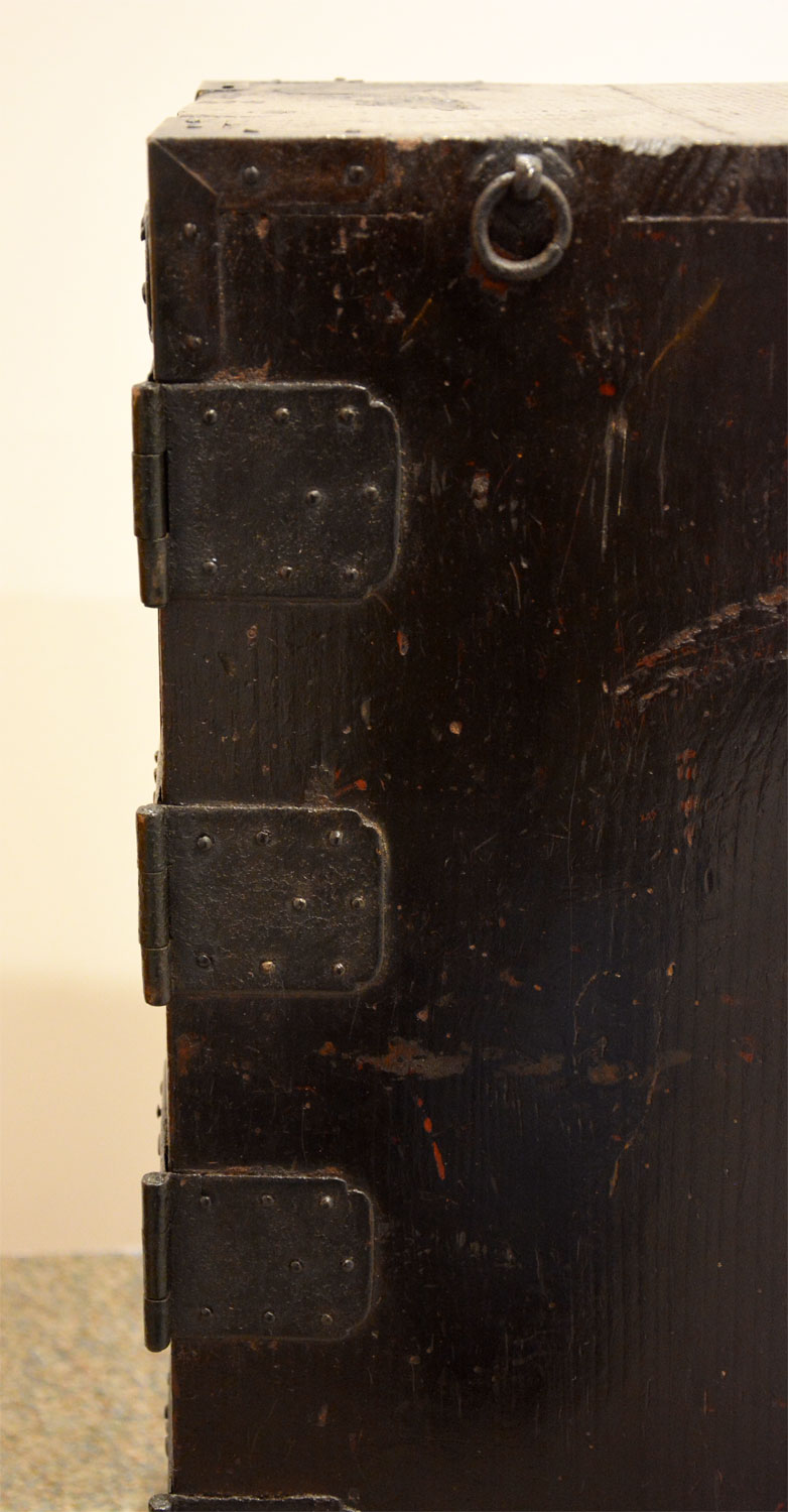 Gyosho bako (peddler’s box). A Gyosho Box is defined by rings on the back of the piece: a peddler would strap the box to their back and travel with their goods. This piece is made of Japanese sugi wood, with iron hardware and ring-shaped handles.