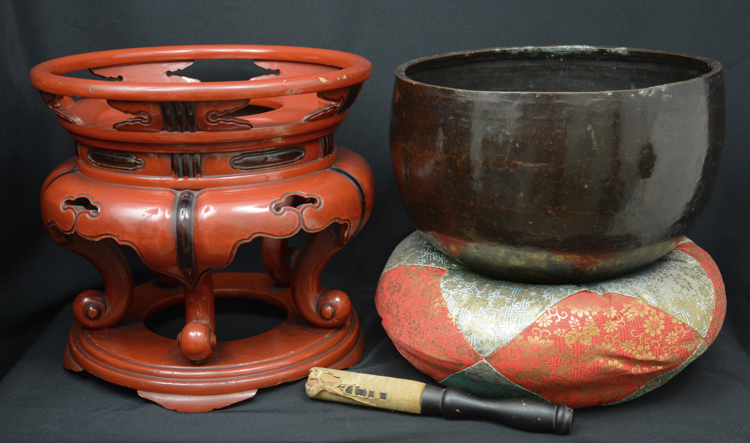 | Medium | brocade covered pillow, bronze bell, leather wrapped striker, red lacquered stand |
