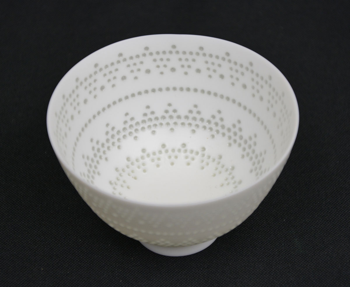 For this small gem, the artist drilled numerous tiny holes in the clay. After bisque firing, a clear glaze was applied filling each of the holes. So the cup will not leak, but has a spectacular luminescent appearance and is very light in weight.