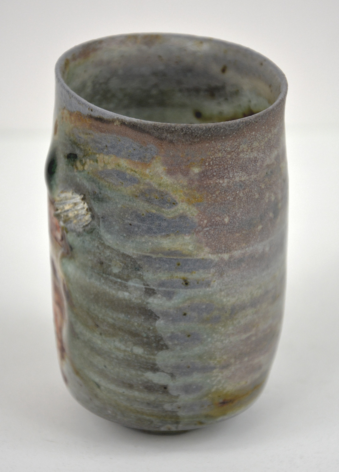 Slightly oval mouth is the opening to a stunning cup. Remnants of the shell used as wadding are evident on the rick dark side, where a deep blue jewel from the ash glaze is a gift from the kiln goddess. Around the side is a rich array of dappled colors.